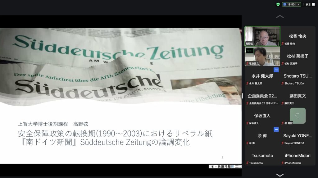 午前の部では、個人・共同研究発表1に参加しました。それぞれ、①安全保障に関する新聞の論調、②記事メトリクスの可視化、③記者クラブに関する当事者の議論、④ニュース・メディアの透明性と、テーマを大きく異にしながらも、いずれも現代のマスメディアにとりアクチュアルな課題に取り組んでいる点が印象的でした。新聞記者の信念・理念と、そのメディア環境とのかかわりが通奏低音をなしていたことを踏まえた質問が、最後に司会の塩谷昌之さんから各報告者へ投げかけられ、本セッションは締め括られました。